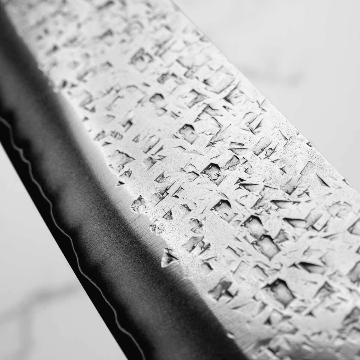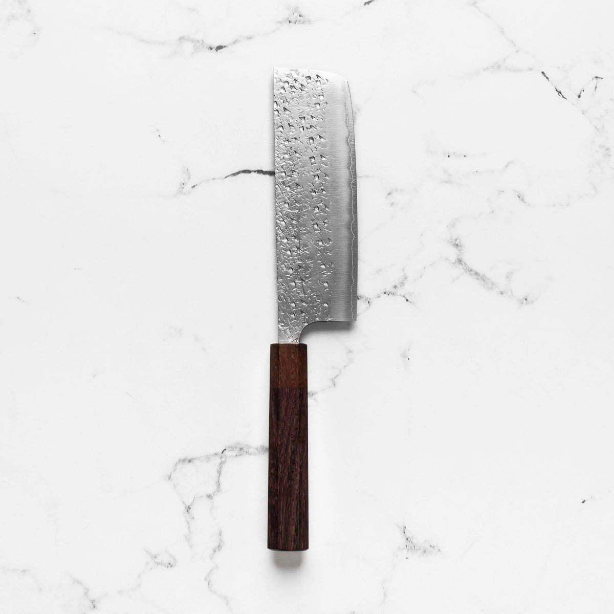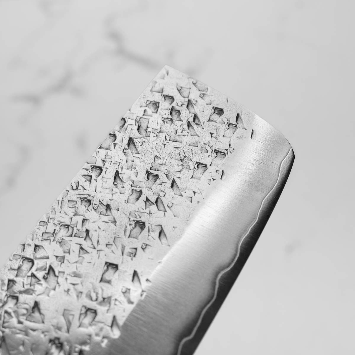 His knives are instantly recognizable for their striking Tsuchime and Suminagashi finishes, thin grinds, and use of high-performance steels such as SG2, HAP40, and stainless-clad Blue Super. Kurosaki’s Fujin series, with its dramatic wind-patterned hammer finish, helped cement his reputation as a blacksmith who blends artistry and technical brilliance in equal measure.