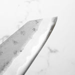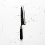 The Kiritsuke knife, a symbol of expertise in Japanese cuisine, is traditionally used by executive chefs. This multi-purpose knife combines features of a slicer and a vegetable knife, with its angled tip and long blade. It excels in precise slicing, chopping, and julienning, making it a prestigious and versatile tool.