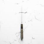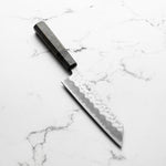 Japanese White Steel #2, a traditional high-carbon steel, is cherished for its purity and fine grain structure, enabling razor-sharp edges, at the cost of being reactive. It is one of the easiest steels to sharpen, but cannot be left wet for even short periods otherwise rust spots can occur. If you’re fastidious in your knife maintenance, this knife steel can be extremely rewarding to use.