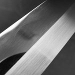 Japanese White Steel #2, a traditional high-carbon steel, is cherished for its purity and fine grain structure, enabling razor-sharp edges, at the cost of being reactive. It is one of the easiest steels to sharpen, but cannot be left wet for even short periods otherwise rust spots can occur. If you’re fastidious in your knife maintenance, this knife steel can be extremely rewarding to use.