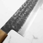Japanese White Steel #2, a traditional high-carbon steel, is cherished for its purity and fine grain structure, enabling razor-sharp edges, at the cost of being reactive. It is one of the easiest steels to sharpen, but cannot be left wet for even short periods otherwise rust spots can occur. If you’re fastidious in your knife maintenance, this knife steel can be extremely rewarding to use.