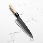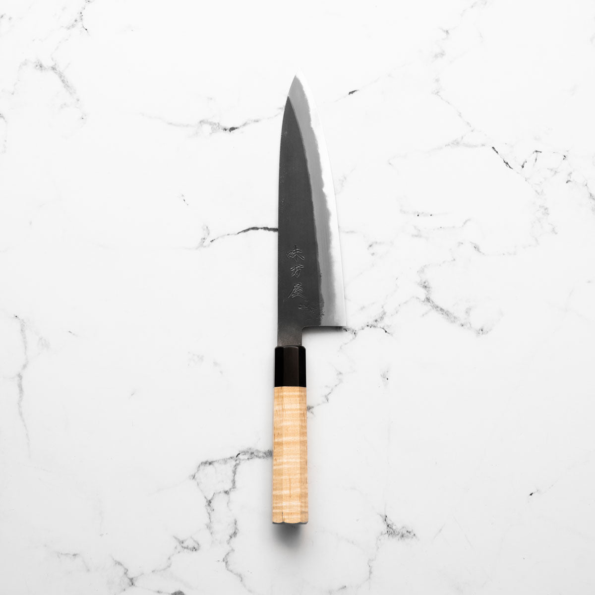 Japanese White Steel #2, a traditional high-carbon steel, is cherished for its purity and fine grain structure, enabling razor-sharp edges, at the cost of being reactive. It is one of the easiest steels to sharpen, but cannot be left wet for even short periods otherwise rust spots can occur. If you’re fastidious in your knife maintenance, this knife steel can be extremely rewarding to use.