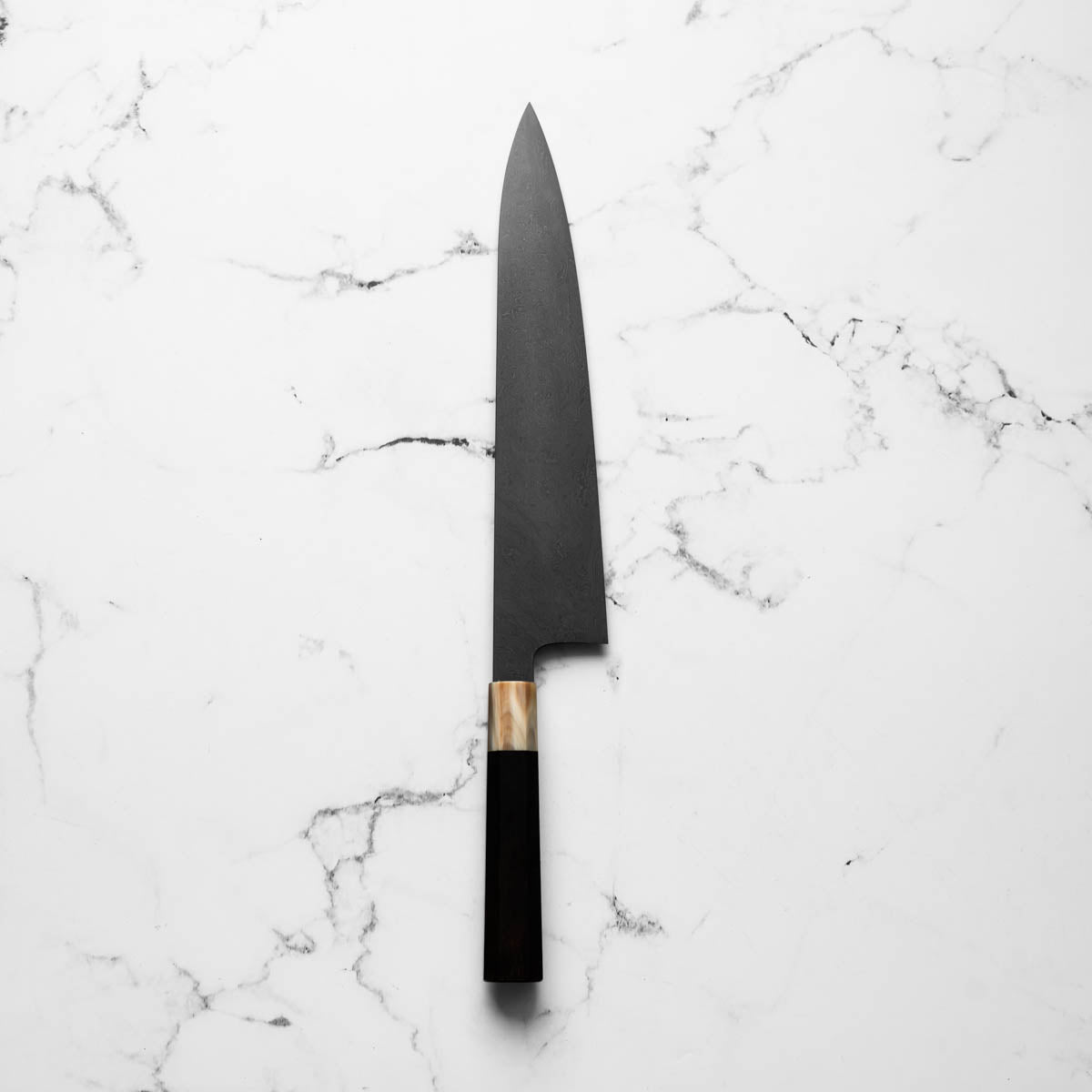 This knife is made from a high-carbon steel and as such, will require a little more care than a regular off-the-shelf knife. It must be dried shortly after use, as prolonged exposure to moisture can cause rust spots to appear. A very light coat of oil during storage also helps to prevent rust spots. A patina (colouration and seasoning of the steel) will occur with use.