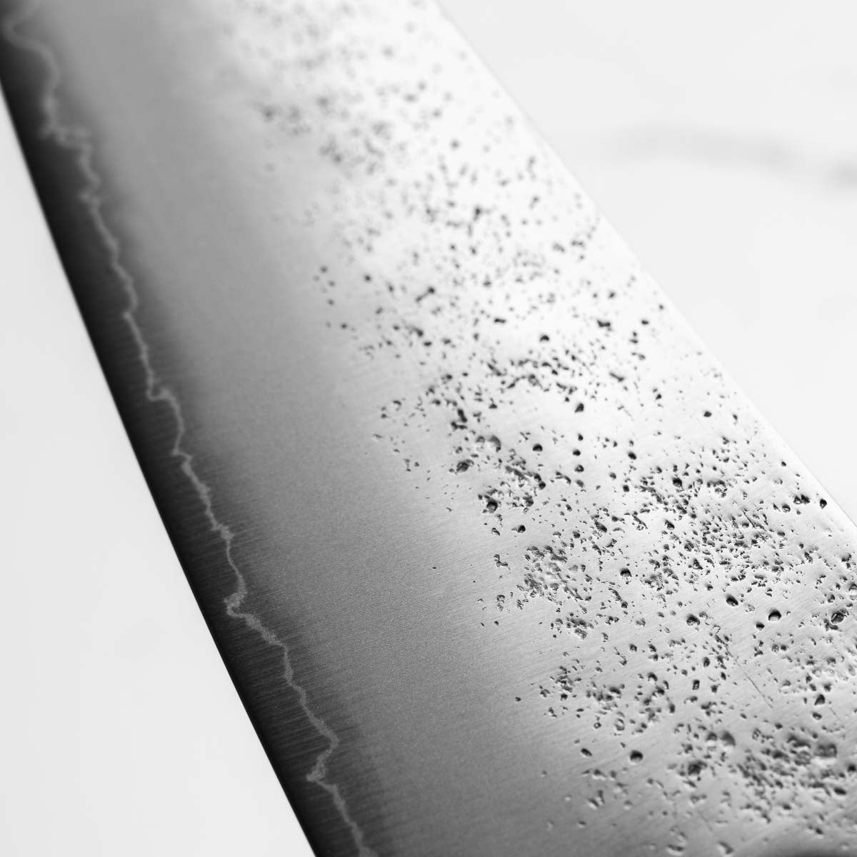 Japanese Ginsan steel, also known as Silver-3 or G3, is an underrated high-grade semi-stainless steel loved by many for being in the ‘goldilocks zone’ of knife steels. It holds a very respectable edge, but is effortless to sharpen. It is considered the semi-stainless version of White 2. It is the knife steel of choice for many home cooks and professional chefs alike.