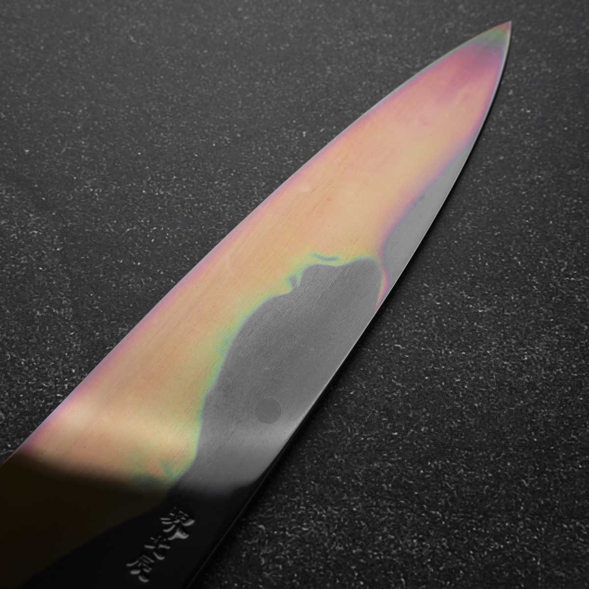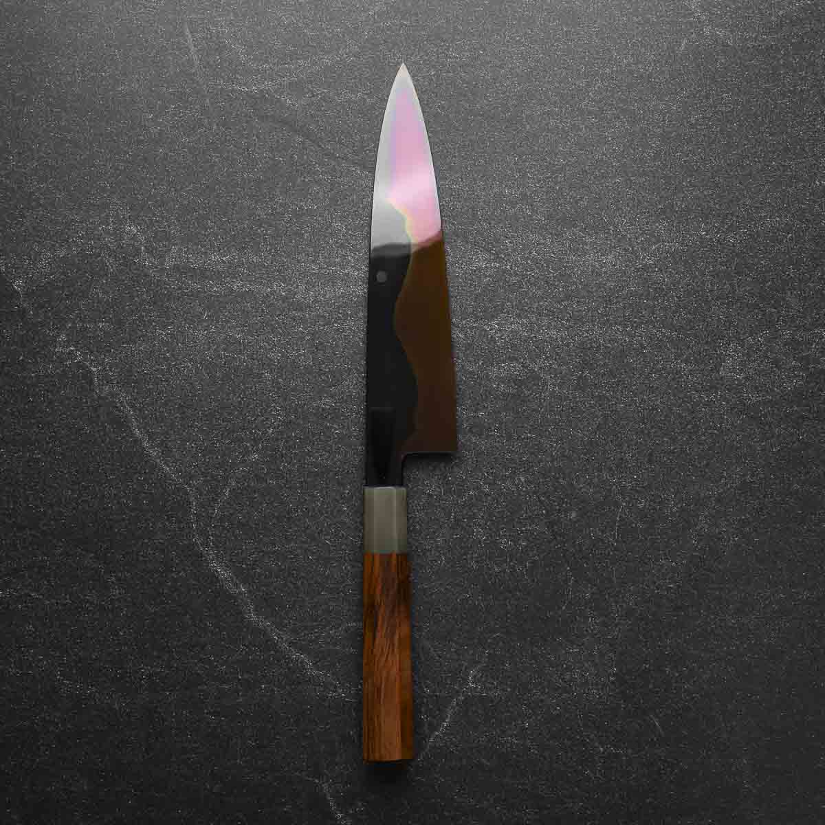 This knife is made from a high-carbon steel and as such, will require a little more care than a regular off-the-shelf knife. It must be dried shortly after use, as prolonged exposure to moisture can cause rust spots to appear. A very light coat of oil during storage also helps to prevent rust spots. A patina (colouration and seasoning of the steel) will occur with use.