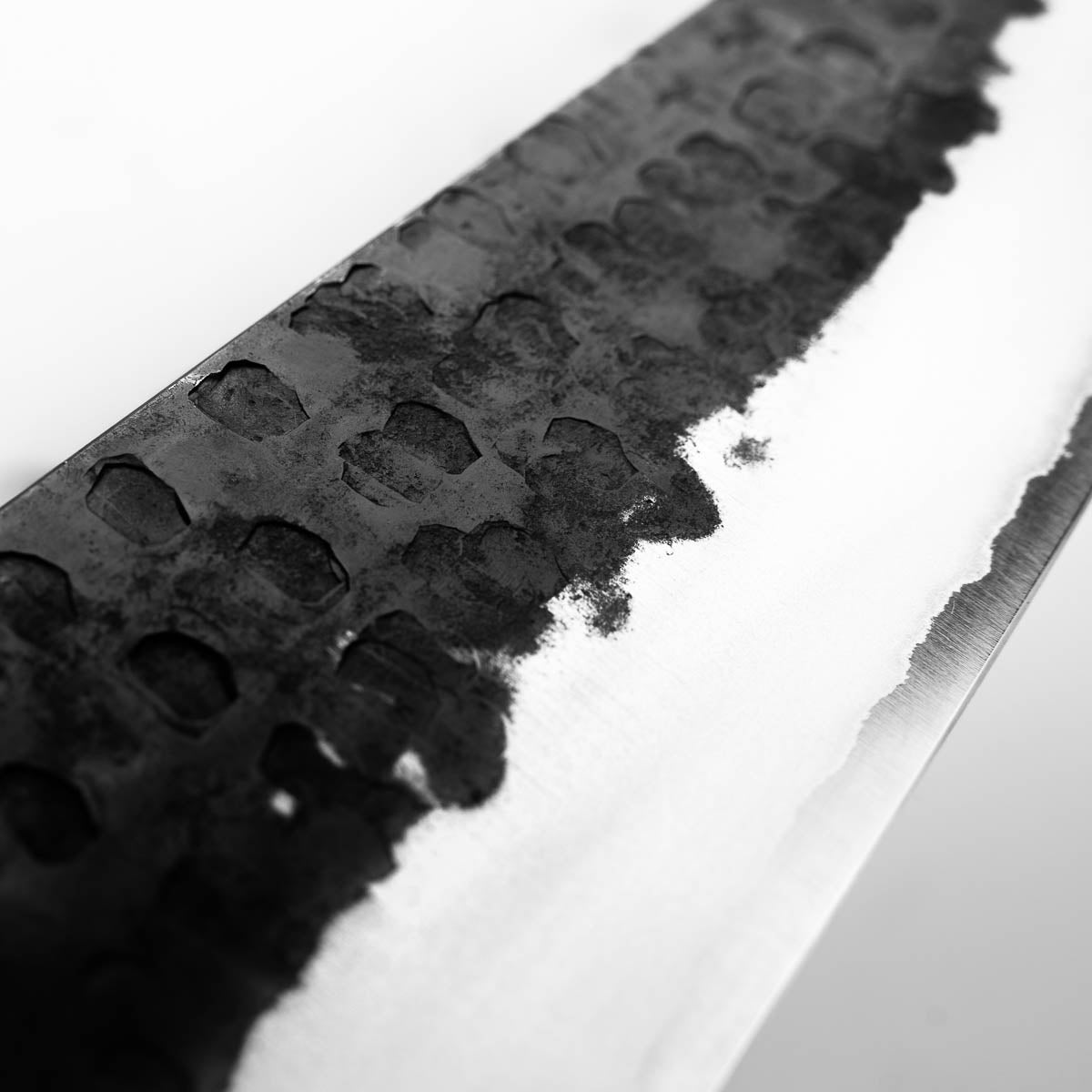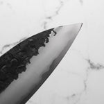 This knife is made from a high-carbon steel and as such, will require a little more care than a regular off-the-shelf knife. It must be dried shortly after use, as prolonged exposure to moisture can cause rust spots to appear. A very light coat of oil during storage also helps to prevent rust spots. A patina (colouration and seasoning of the steel) will occur with use.