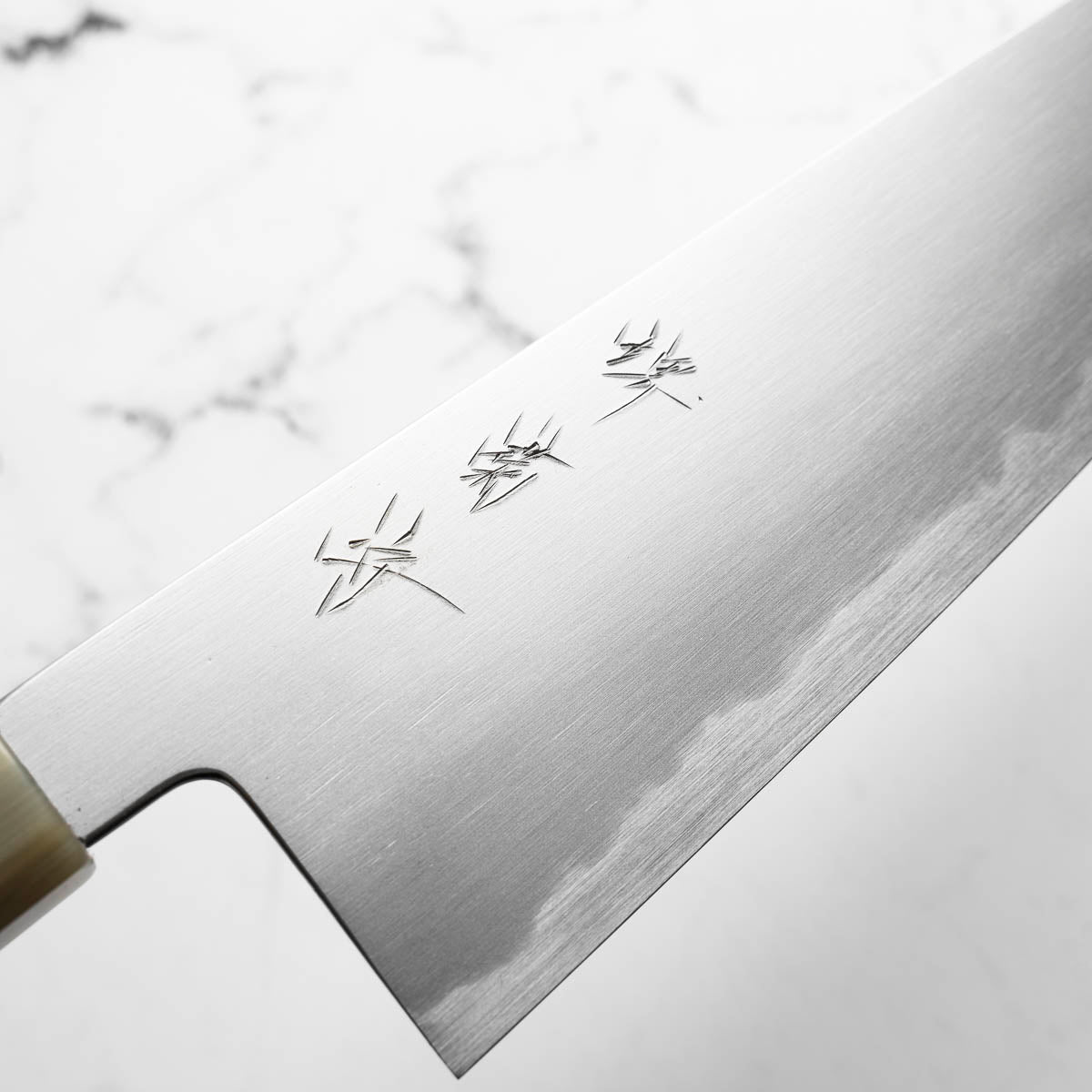 This knife is made from a high-carbon steel and as such, will require a little more care than a regular off-the-shelf knife. It must be dried shortly after use, as prolonged exposure to moisture can cause rust spots to appear. A very light coat of oil during storage also helps to prevent rust spots. A patina (colouration and seasoning of the steel) will occur with use.
