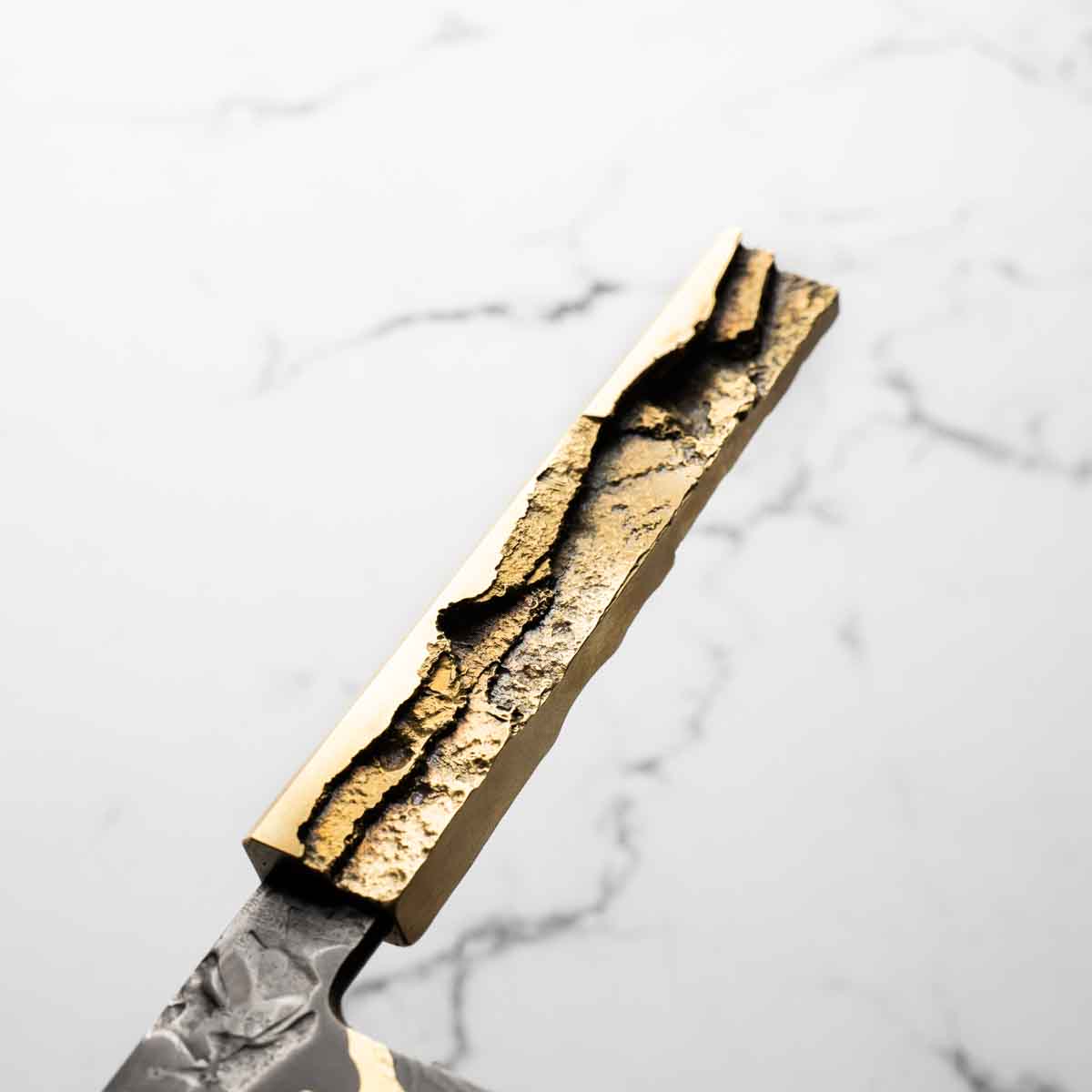 This knife is made from a high-carbon steel and as such, will require a little more care than a regular off-the-shelf knife. It must be dried shortly after use, as prolonged exposure to moisture can cause rust spots to appear. A very light coat of oil during storage also helps to prevent rust spots. A patina (colouration and seasoning of the steel) will occur with use.