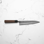 Japanese White Steel #2, a traditional high-carbon steel, is cherished for its purity and fine grain structure, enabling razor-sharp edges, at the cost of being reactive. It is one of the easiest steels to sharpen, but cannot be left wet for even short periods otherwise rust spots can occur. If you’re fastidious in your knife maintenance, this knife steel can be extremely rewarding to use.