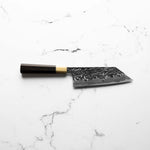 Embracing a rapid rise in popularity for his unique designs and committment to striving for perfection, Shunsuke Manaka is the man behind Kisuke knives. From the sketchbook to the kitchen, he is the sole craftsman behind the entire knifemaking process. Shunsuke engineers these knives using a process known as Warikomi, whereby a glowing hot piece of steel is split, and the core steel is wedged in and forged together. The split steel becomes the outer layers, and the core steel is exposed at the edge. This process produces a stronger, tougher more durable blade.