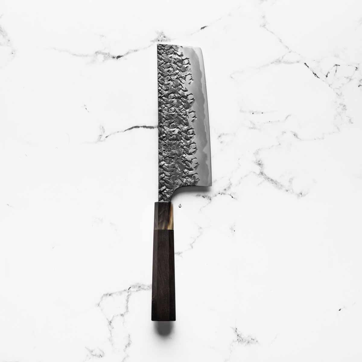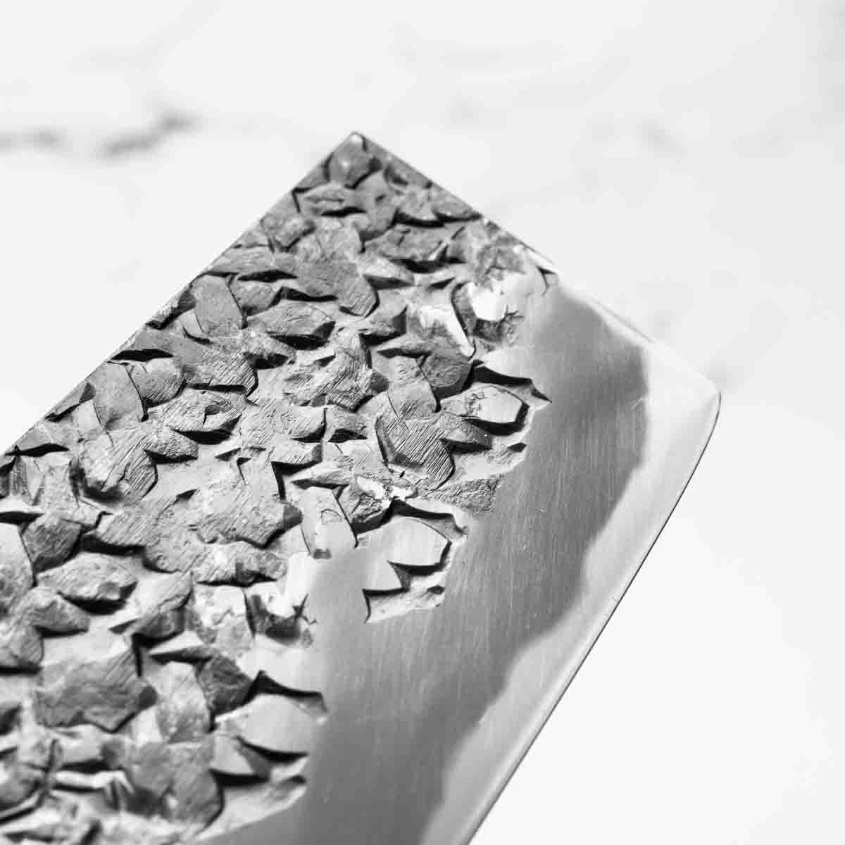 Embracing a rapid rise in popularity for his unique designs and committment to striving for perfection, Shunsuke Manaka is the man behind Kisuke knives. From the sketchbook to the kitchen, he is the sole craftsman behind the entire knifemaking process. Shunsuke engineers these knives using a process known as Warikomi, whereby a glowing hot piece of steel is split, and the core steel is wedged in and forged together. The split steel becomes the outer layers, and the core steel is exposed at the edge. This process produces a stronger, tougher more durable blade.