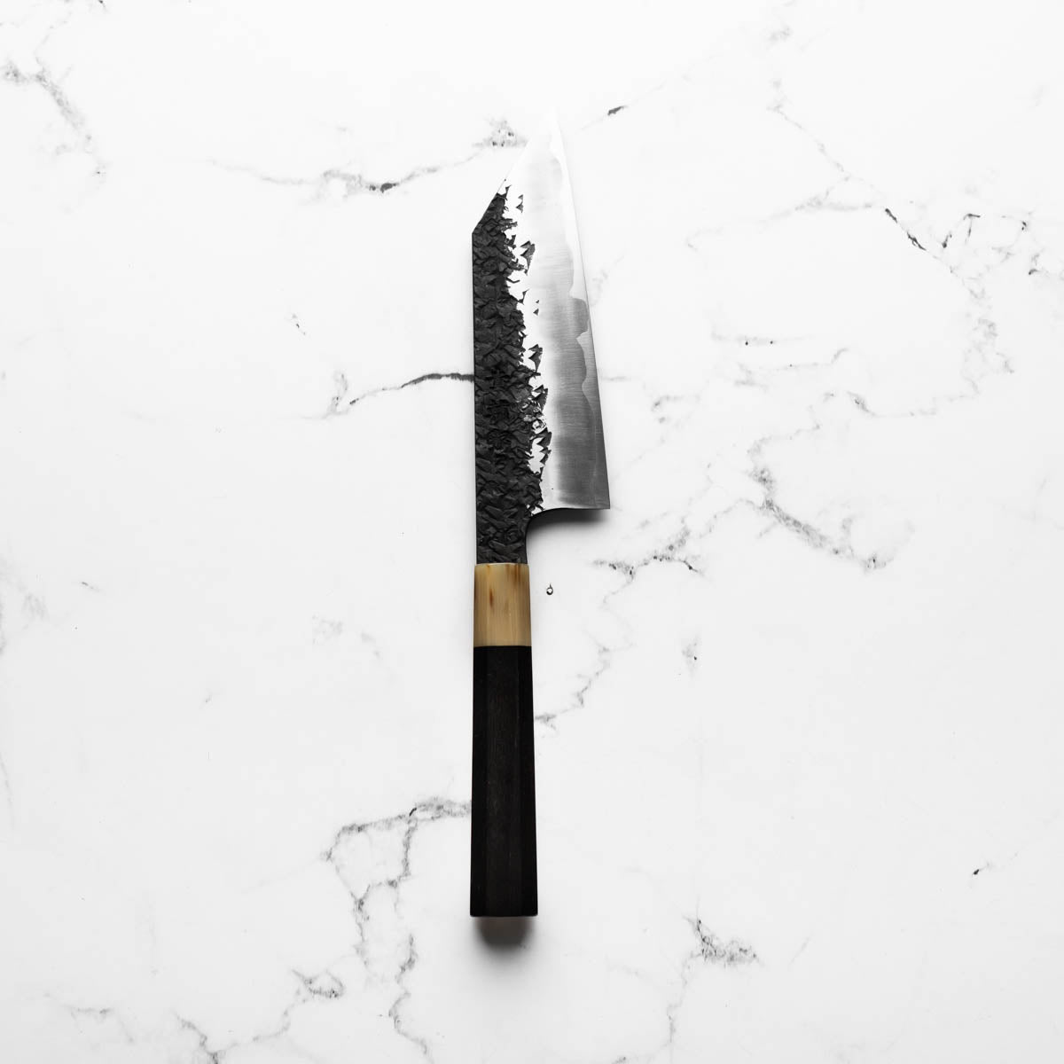 Embracing a rapid rise in popularity for his unique designs and committment to striving for perfection, Shunsuke Manaka is the man behind Kisuke knives. From the sketchbook to the kitchen, he is the sole craftsman behind the entire knifemaking process. Shunsuke engineers these knives using a process known as Warikomi, whereby a glowing hot piece of steel is split, and the core steel is wedged in and forged together. The split steel becomes the outer layers, and the core steel is exposed at the edge. This process produces a stronger, tougher more durable blade.