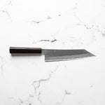 The Kiritsuke knife, a symbol of expertise in Japanese cuisine, is traditionally used by executive chefs. This multi-purpose knife combines features of a slicer and a vegetable knife, with its angled tip and long blade. It excels in precise slicing, chopping, and julienning, making it a prestigious and versatile tool.