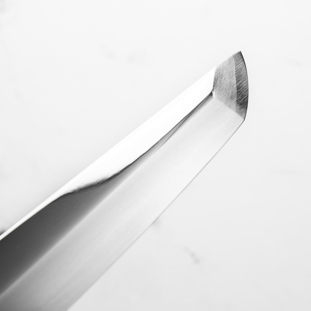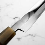 The Takohiki knife is a specialized Japanese knife, traditionally crafted for slicing octopus and other seafood. It is a regional variation of the sashimi knife, originating from the Kansai area of Japan. The Takohiki features a long, rectangular blade with a straightedge and a blunt tip, designed for achieving clean, precise cuts of fish or delicate ingredients. Its shape allows chefs to make long, uninterrupted pulls through the food, reducing friction and maintaining the integrity of each slice. This knife is ideal for preparing sashimi with exceptional control and precision, embodying Japanese culinary artistry.