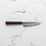 The Petty knife, a quintessential tool in Japanese cuisine, is a smaller utility knife used for precise, delicate tasks. Often considered a smaller sibling to the chef's knife, it excels in hand-held tasks like peeling, trimming, and intricate cutting. Its versatility makes it an essential for detailed culinary work.
