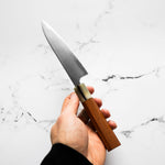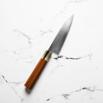 The Petty knife, a quintessential tool in Japanese cuisine, is a smaller utility knife used for precise, delicate tasks. Often considered a smaller sibling to the chef's knife, it excels in hand-held tasks like peeling, trimming, and intricate cutting. Its versatility makes it an essential for detailed culinary work.