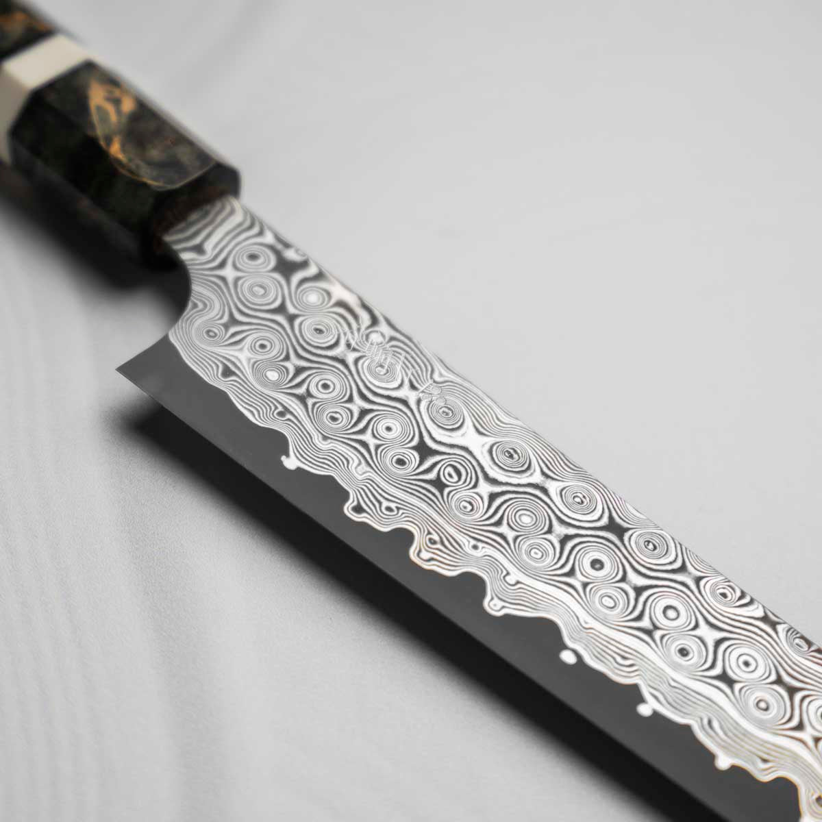 Nigara Hamono are truly some of the most experienced knifemakers in Japan. Now on their 8th generation of blacksmiths, they are masters at stainless damascus forging and heat treatment. The Anmon Damascus we have available have a matte finish and are polished underneath, resulting in a brilliant visual contrast.