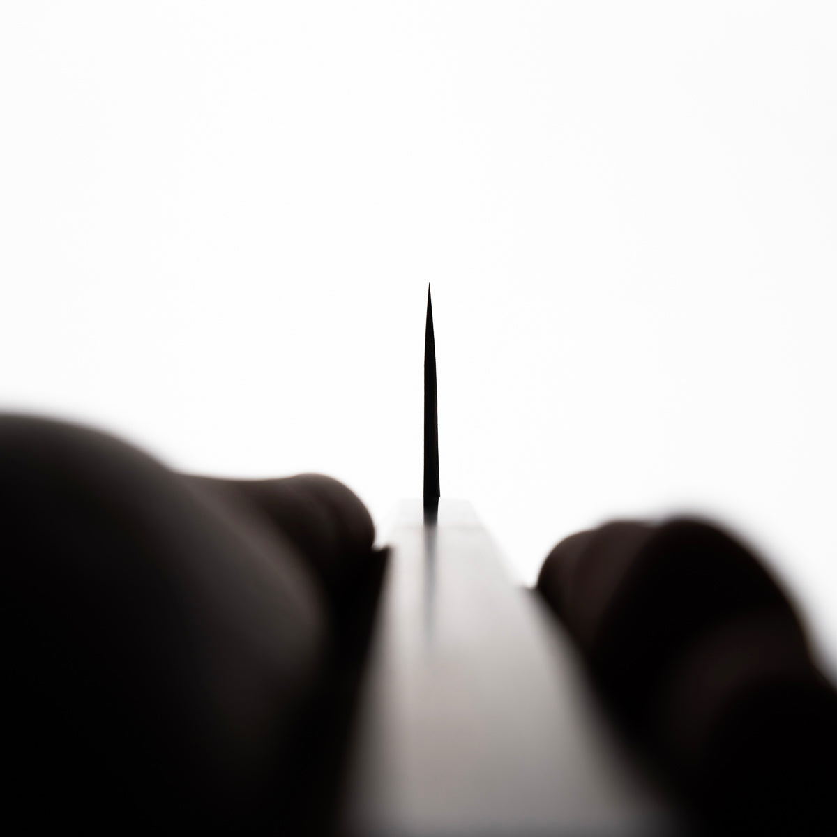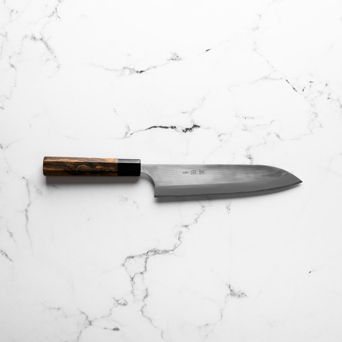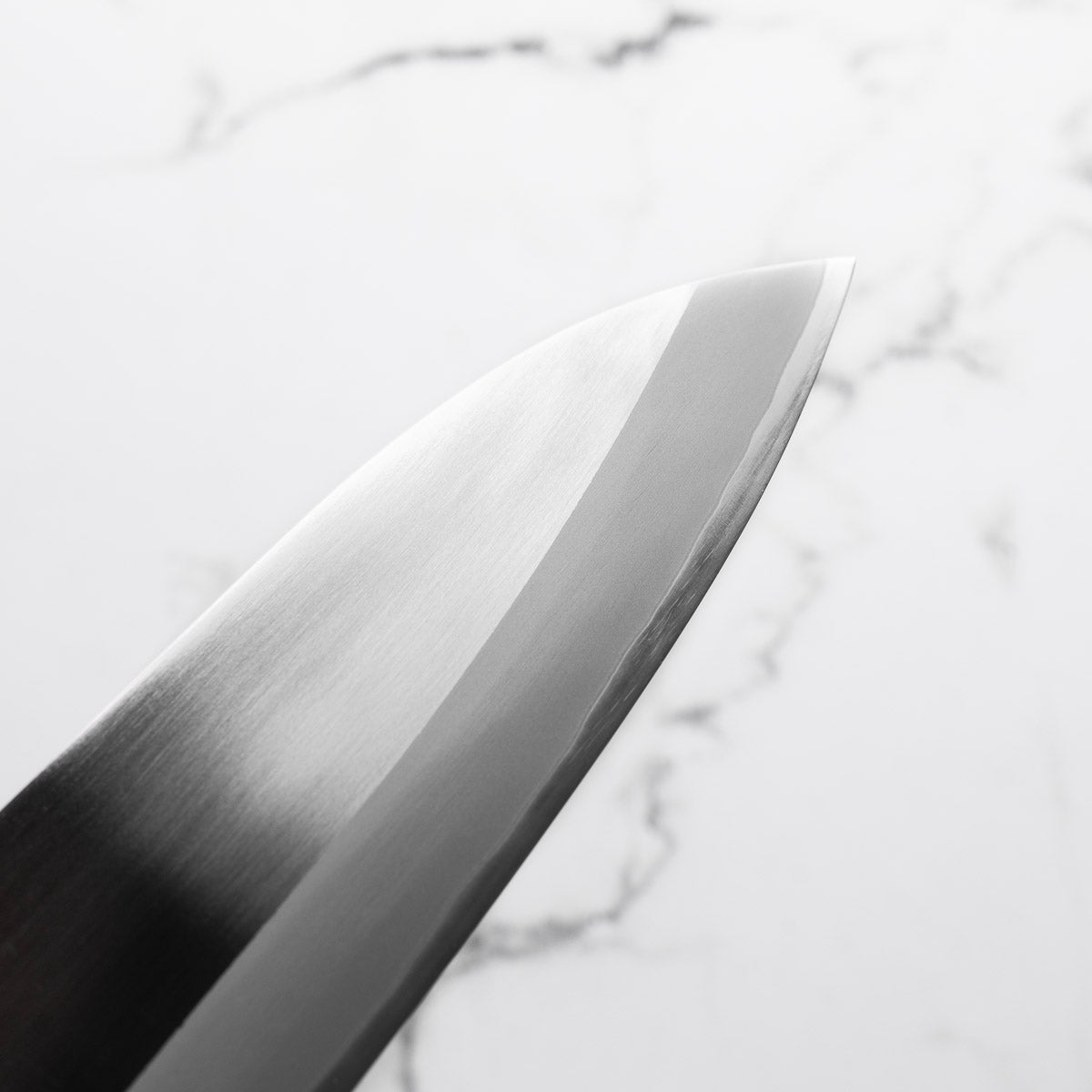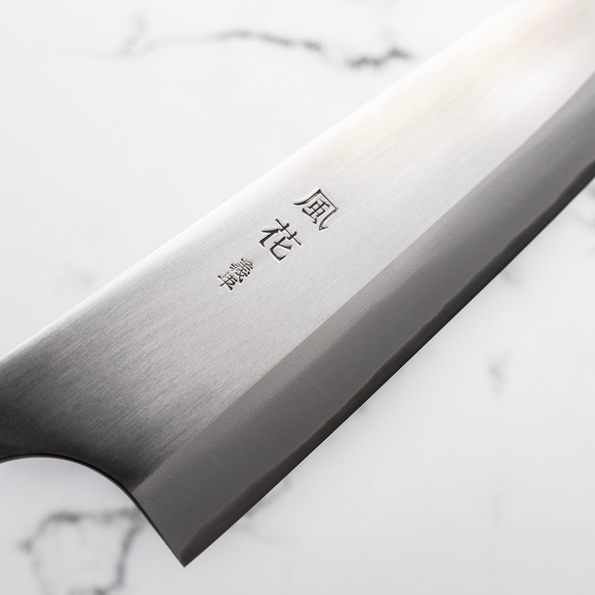 HAP40 is an extremely hard (often HRC65) powder semi-stainless steel by Hitachi Metals in Japan. It holds an edge for an extremely long time and will develop a patina with use. It has enough chromium content to ward off rust spots if left wet for short periods, but best to be kept dry after use. It can be tricky to sharpen without a coarse stone of around 500 grit to get the burr moving.