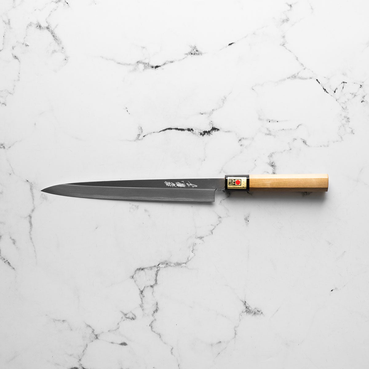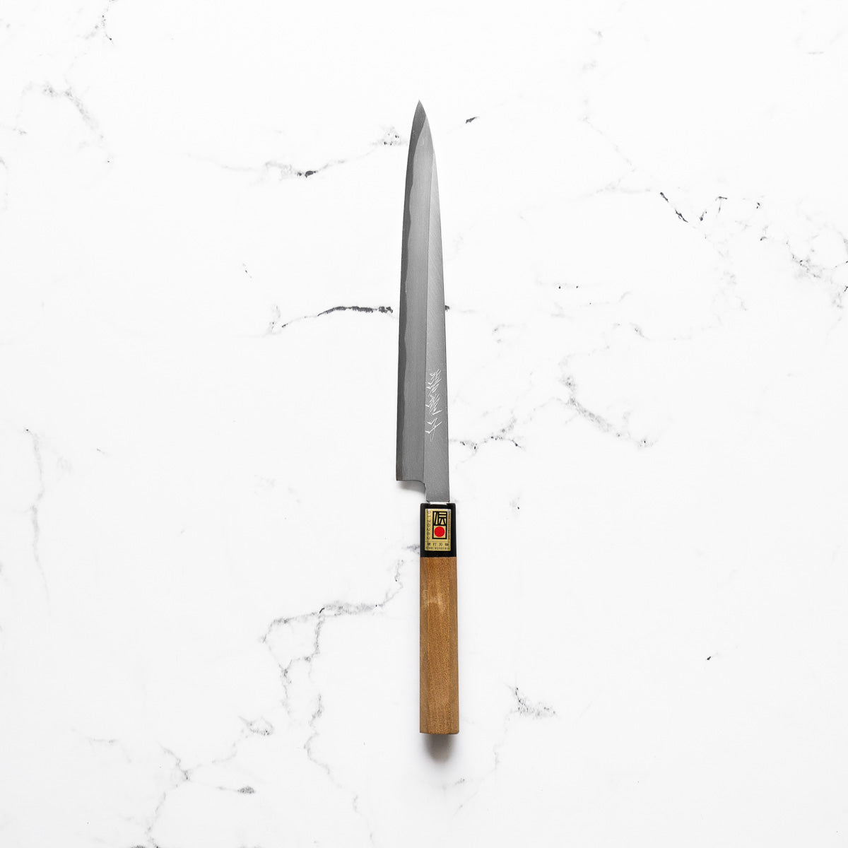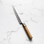 The Yanagiba knife, a staple in traditional Japanese cuisine, is a slender, long-bladed knife primarily used for slicing sashimi and sushi. Its graceful, single-beveled edge guarantees precise, thin cuts, preserving the texture and integrity of the fish. Revered for its sharpness and balance, the Yanagiba is essential for authentic Japanese food preparation.