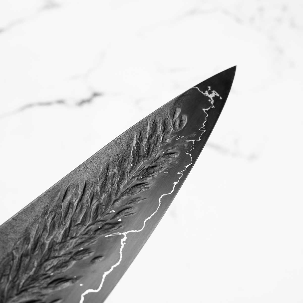 This knife is made from a high-carbon steel and as such, will require a little more care than a regular off-the-shelf knife. It must be dried shortly after use, as prolonged exposure to moisture can cause rust spots to appear. A very light coat of oil during storage also helps to prevent rust spots. A patina (colouration and seasoning of the steel) will occur with use.