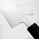 Japanese White Steel #2, a traditional high-carbon steel, is cherished for its purity and fine grain structure, enabling razor-sharp edges, at the cost of being reactive. It is one of the easiest steels to sharpen, but cannot be left wet for even short periods otherwise rust spots can occur. If you’re fastidious in your knife maintenance, this knife steel can be extremely rewarding to use.