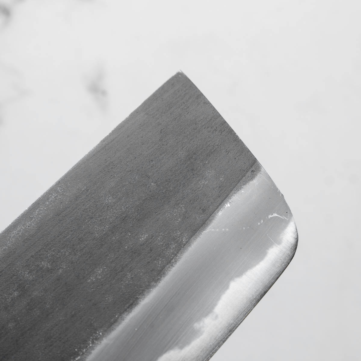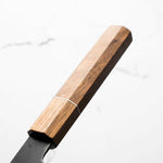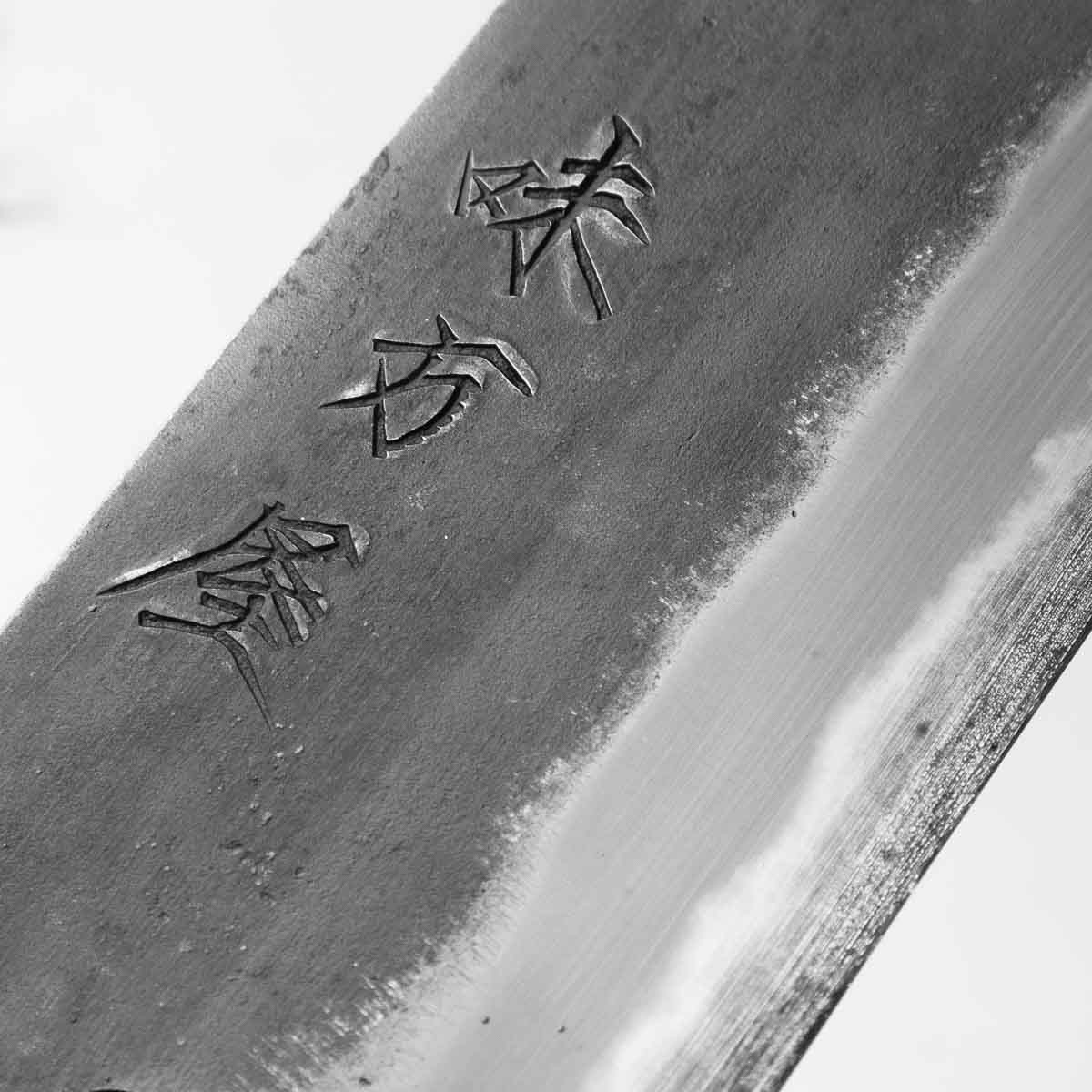 Japanese White Steel #2, a traditional high-carbon steel, is cherished for its purity and fine grain structure, enabling razor-sharp edges, at the cost of being reactive. It is one of the easiest steels to sharpen, but cannot be left wet for even short periods otherwise rust spots can occur. If you’re fastidious in your knife maintenance, this knife steel can be extremely rewarding to use.