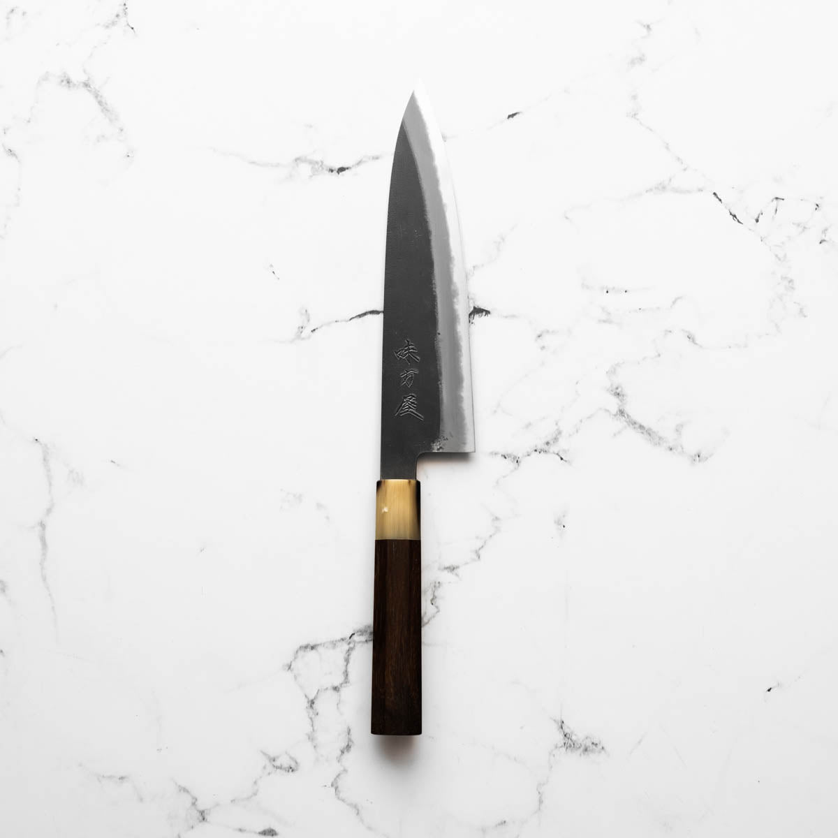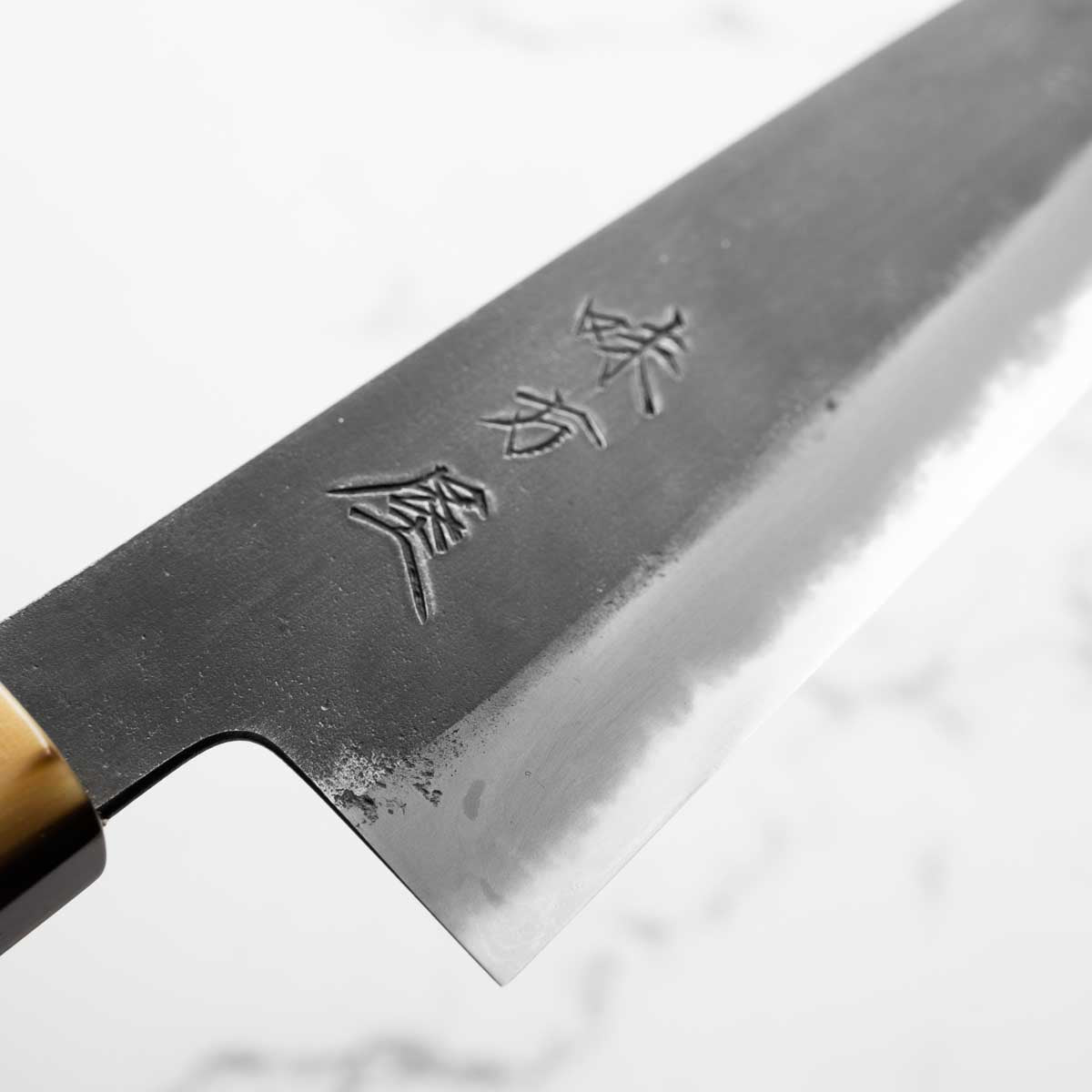Japanese White Steel #2, a traditional high-carbon steel, is cherished for its purity and fine grain structure, enabling razor-sharp edges, at the cost of being reactive. It is one of the easiest steels to sharpen, but cannot be left wet for even short periods otherwise rust spots can occur. If you’re fastidious in your knife maintenance, this knife steel can be extremely rewarding to use.