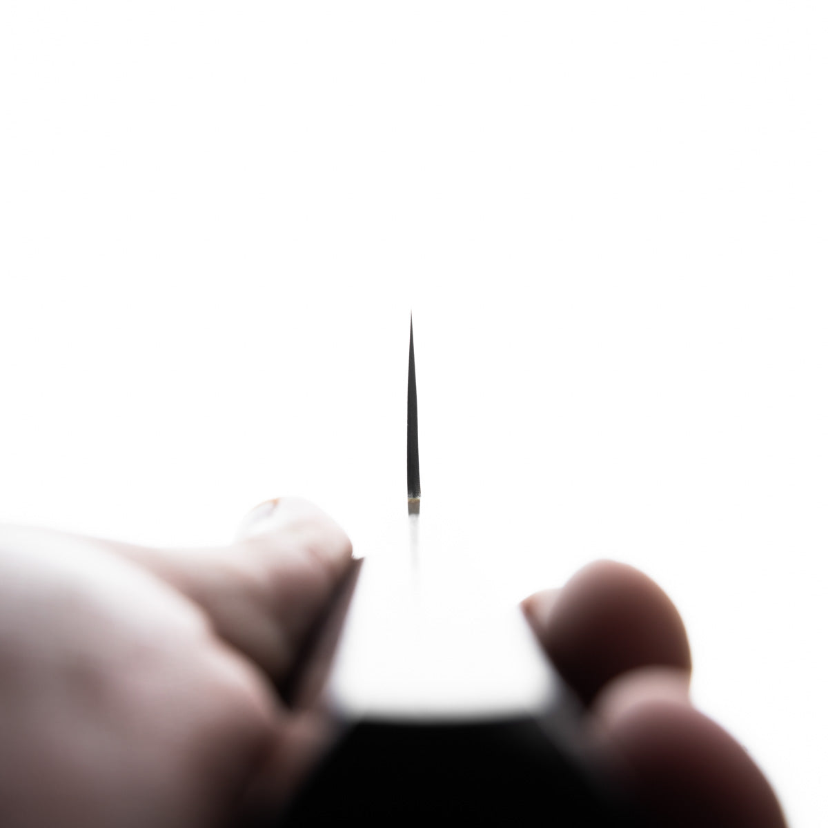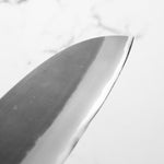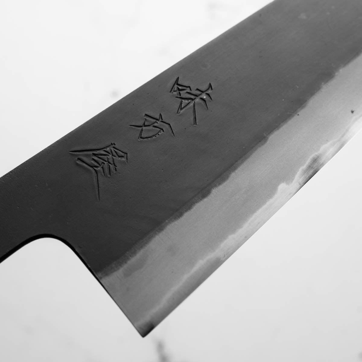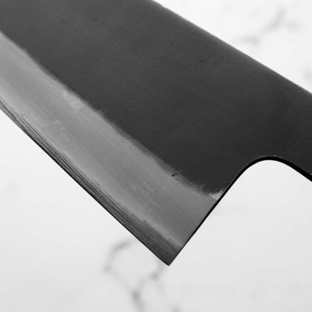Japanese White Steel #2, a traditional high-carbon steel, is cherished for its purity and fine grain structure, enabling razor-sharp edges, at the cost of being reactive. It is one of the easiest steels to sharpen, but cannot be left wet for even short periods otherwise rust spots can occur. If you’re fastidious in your knife maintenance, this knife steel can be extremely rewarding to use.