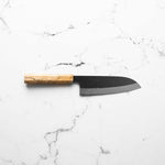 Japanese White Steel #2, a traditional high-carbon steel, is cherished for its purity and fine grain structure, enabling razor-sharp edges, at the cost of being reactive. It is one of the easiest steels to sharpen, but cannot be left wet for even short periods otherwise rust spots can occur. If you’re fastidious in your knife maintenance, this knife steel can be extremely rewarding to use.