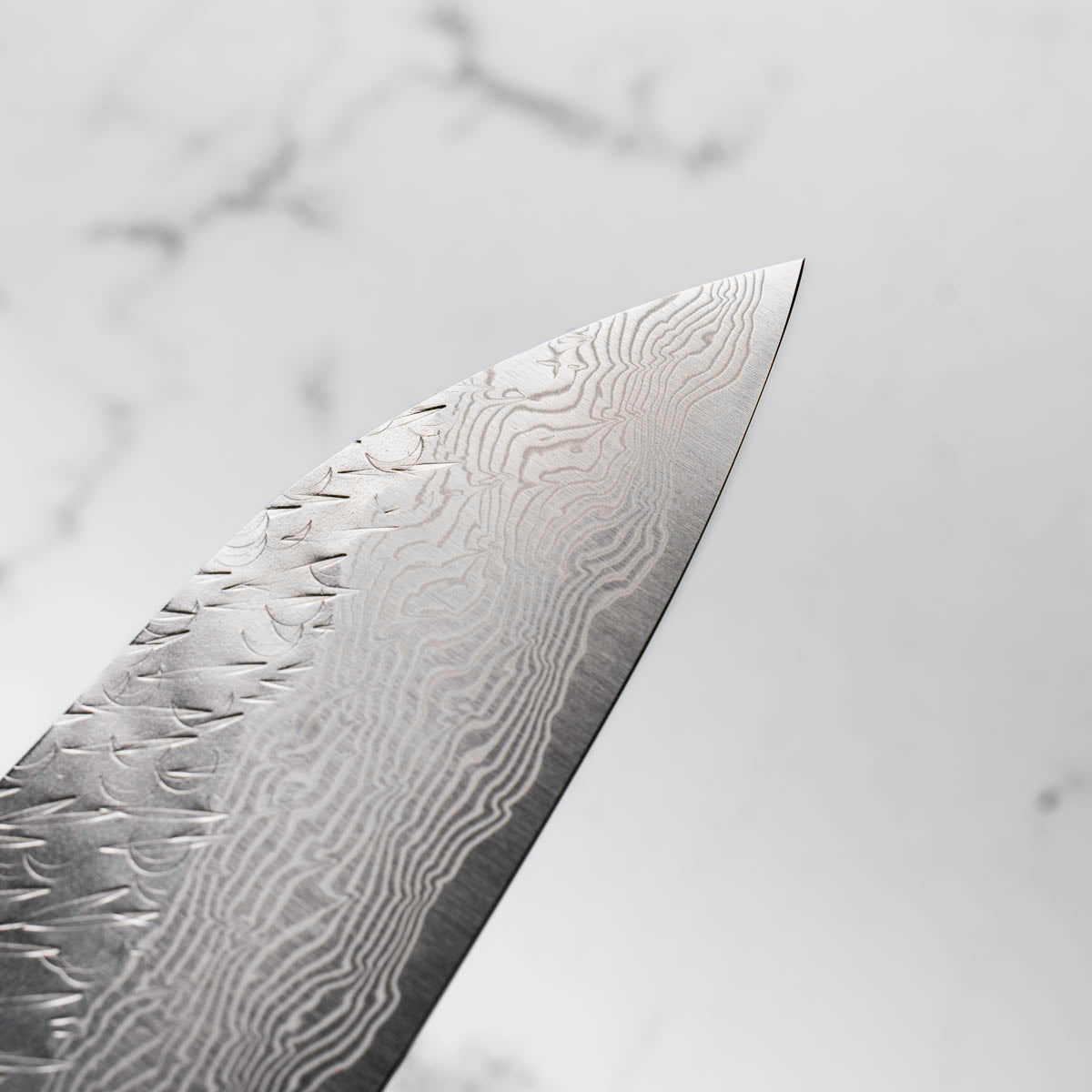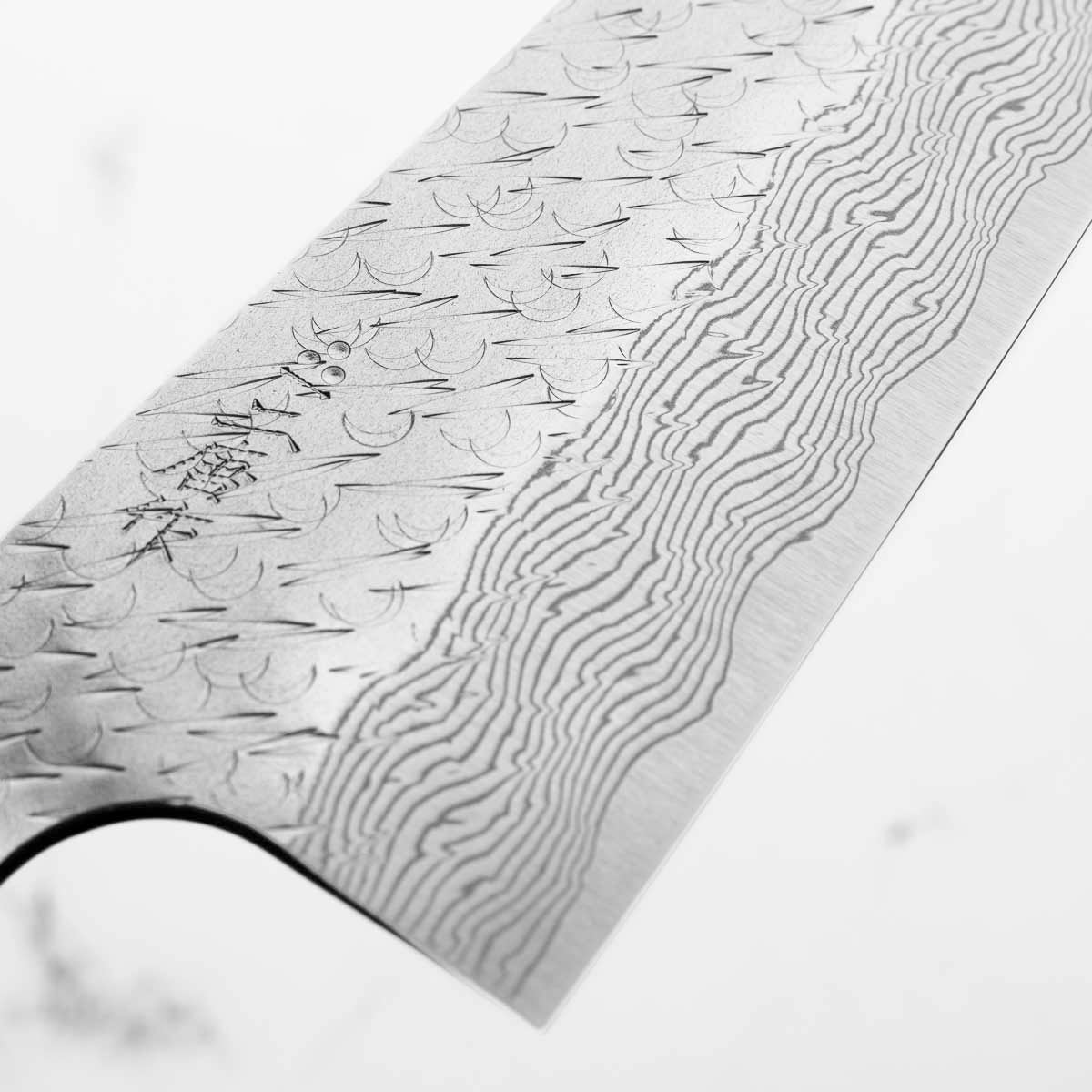 Nigara Hamono are truly some of the most experienced knifemakers in Japan. Now on their 8th generation of blacksmiths, they are masters at stainless damascus forging and heat treatment. The Anmon Damascus we have available have a matte finish and are polished underneath, resulting in a brilliant visual contrast.