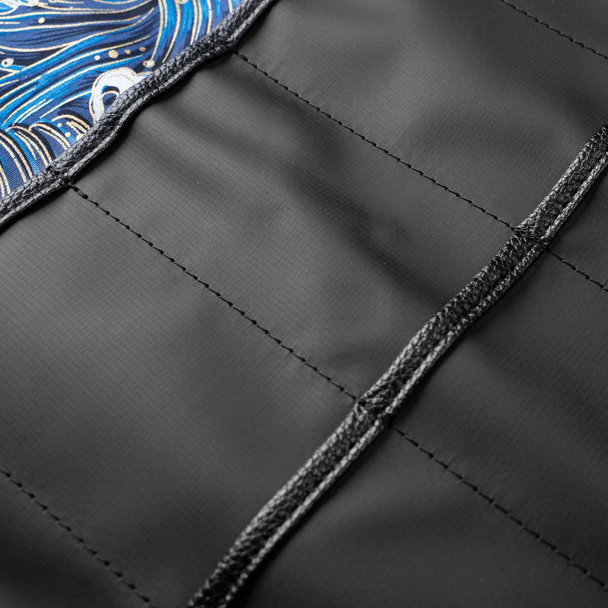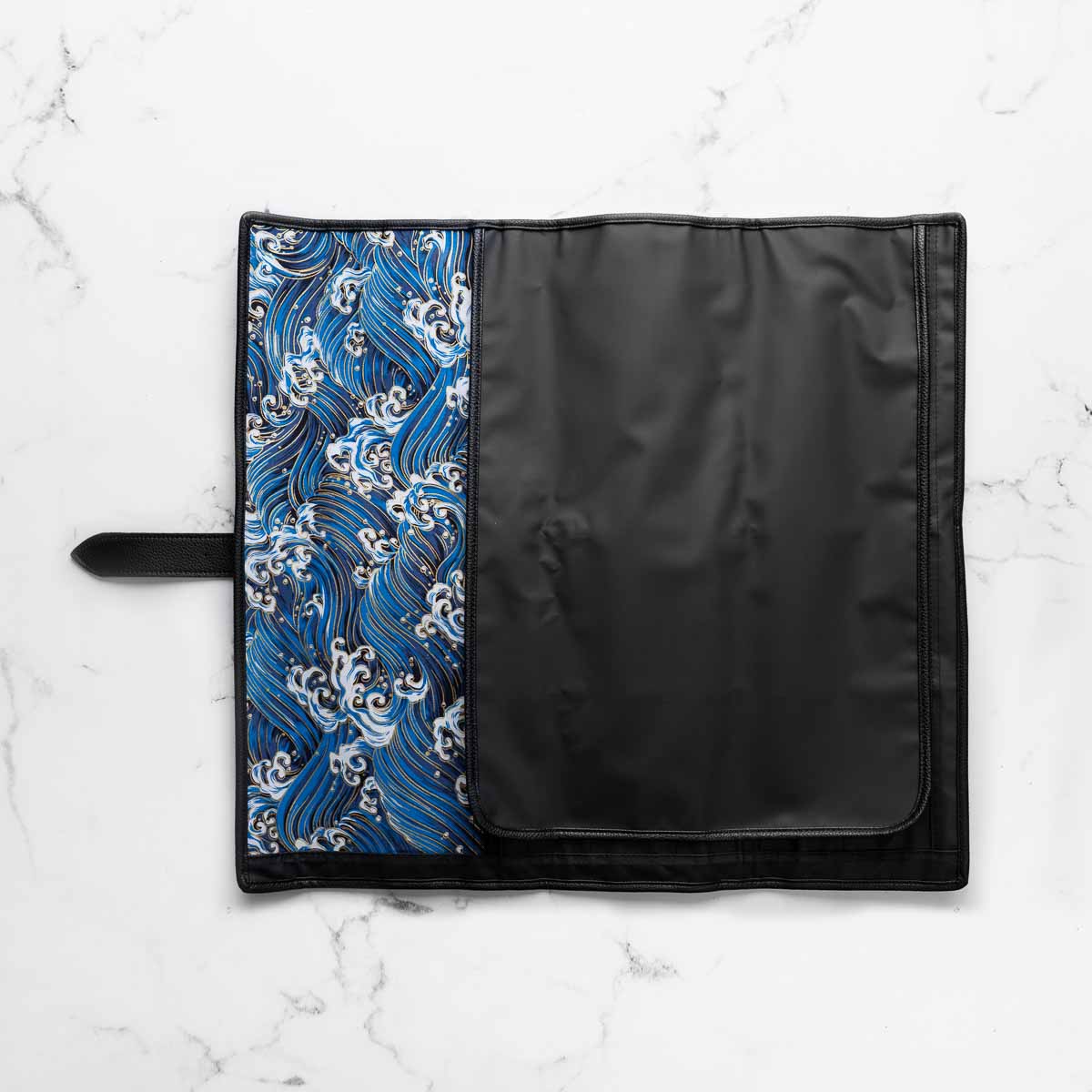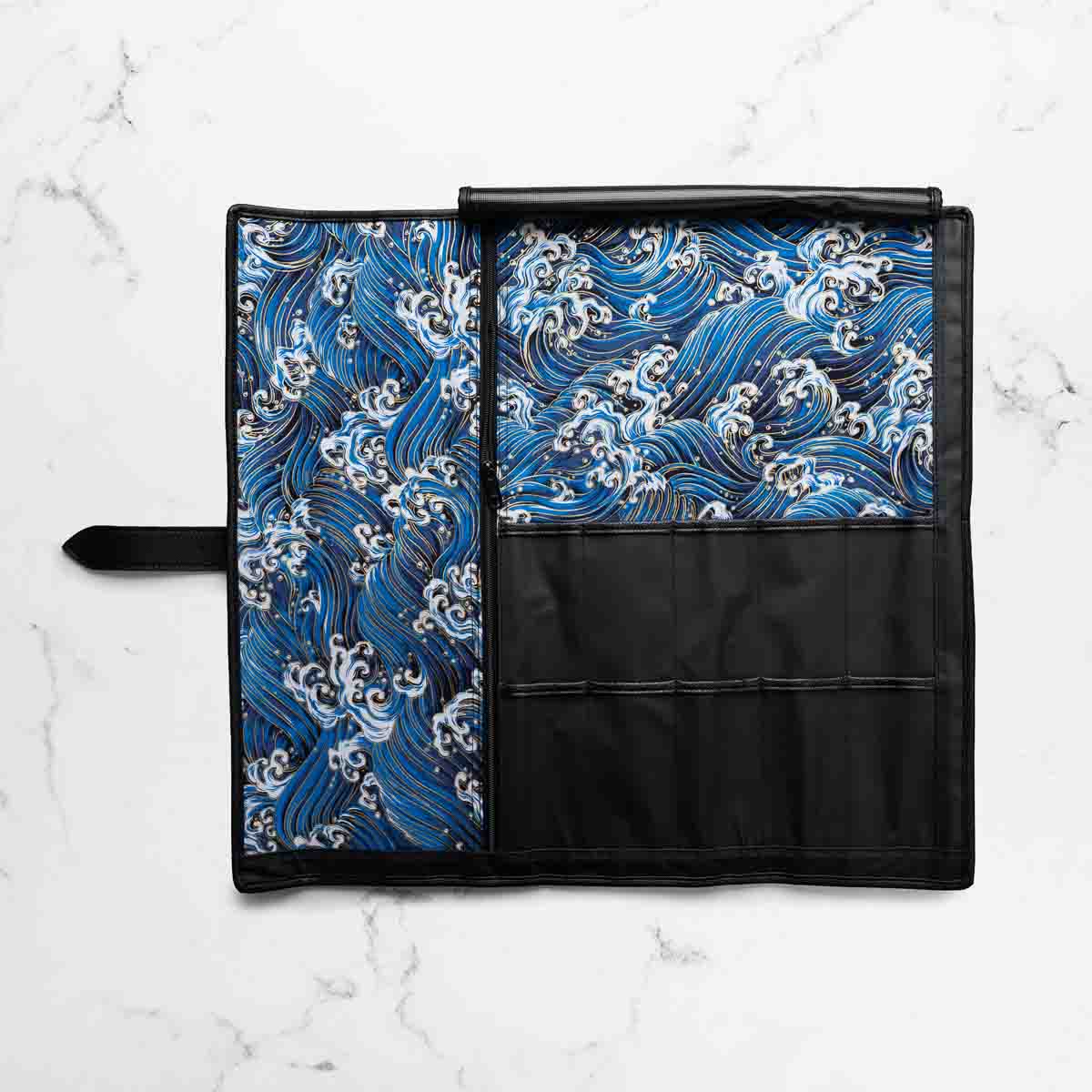 Elevate your culinary travels with the assured protection of the 5 Pocket 1000D PVC Chef Knife Bag. This fundamental bag is meticulously crafted for both accomplished chefs and emerging culinary talents, showcasing a streamlined roll-up design paired with five dedicated knife pockets. This version is lined with a beautiful blue and gold Hokusai inspired wave pattern.