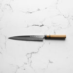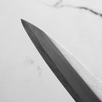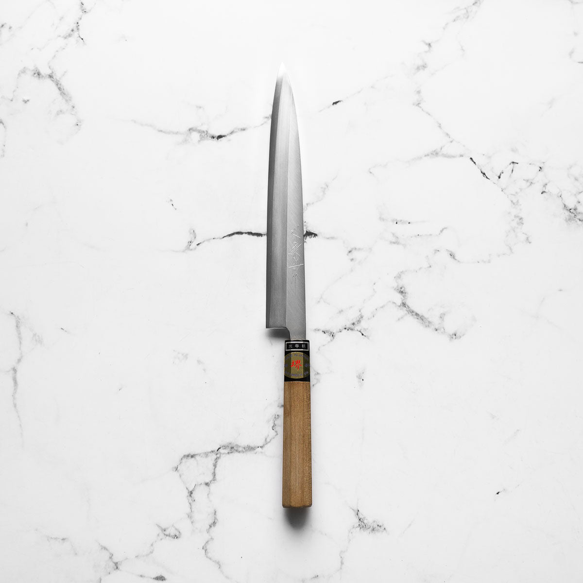 The Yanagiba knife, a staple in traditional Japanese cuisine, is a slender, long-bladed knife primarily used for slicing sashimi and sushi. Its graceful, single-beveled edge guarantees precise, thin cuts, preserving the texture and integrity of the fish. Revered for its sharpness and balance, the Yanagiba is essential for authentic Japanese food preparation.