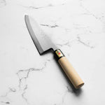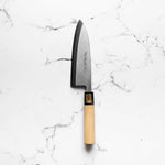 The Deba knife, deeply rooted in Japanese culinary tradition, is a robust, single-bevel knife (sometimes double) primarily designed for fileting fish. Its thick, heavy blade effortlessly glides through fish bones and joints, while preserving delicate flesh. Ideal for seafood preparation, the Deba is a staple in Japanese kitchens for its precision and strength.