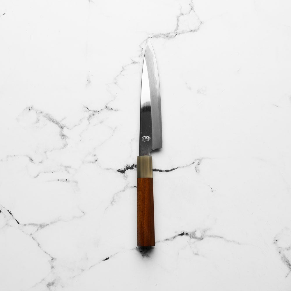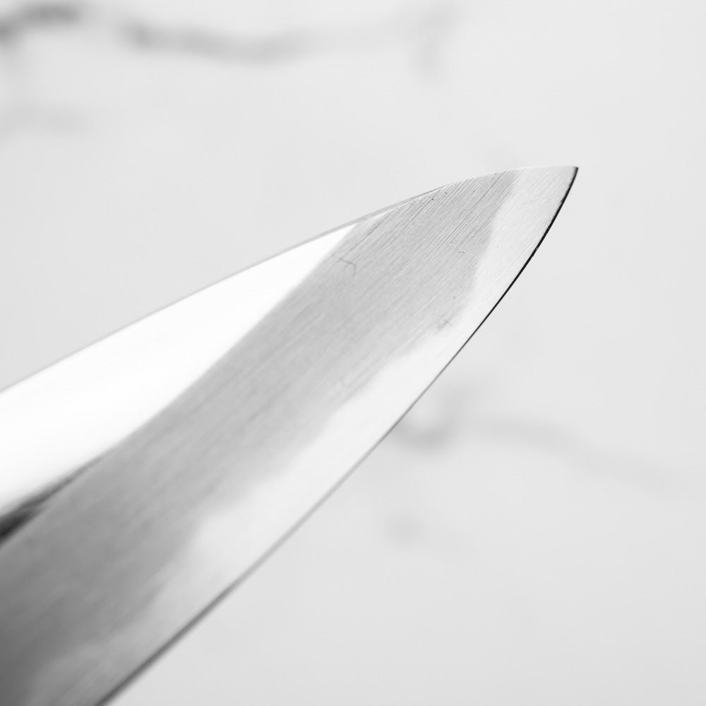 The Petty knife, a quintessential tool in Japanese cuisine, is a smaller utility knife used for precise, delicate tasks. Often considered a smaller sibling to the chef's knife, it excels in hand-held tasks like peeling, trimming, and intricate cutting. Its versatility makes it an essential for detailed culinary work.