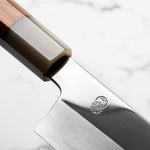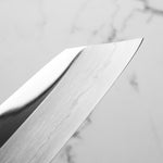 The Kiritsuke knife, a symbol of expertise in Japanese cuisine is similar to the Gyuto but has a flatter profile. This multi-purpose knife combines features of a slicer and a vegetable knife, with its angled tip and long blade. It excels in precise slicing, chopping, and julienning, making it a prestigious and versatile tool.
