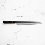 The Sujihiki knife, a traditional Japanese slicer, is designed for carving and fileting. With its long, narrow blade, typically ranging from 240mm to 330mm, it excels in creating clean, smooth cuts through meat and fish. Its length ensures long, uninterrupted strokes, making it perfect for precise slicing tasks.