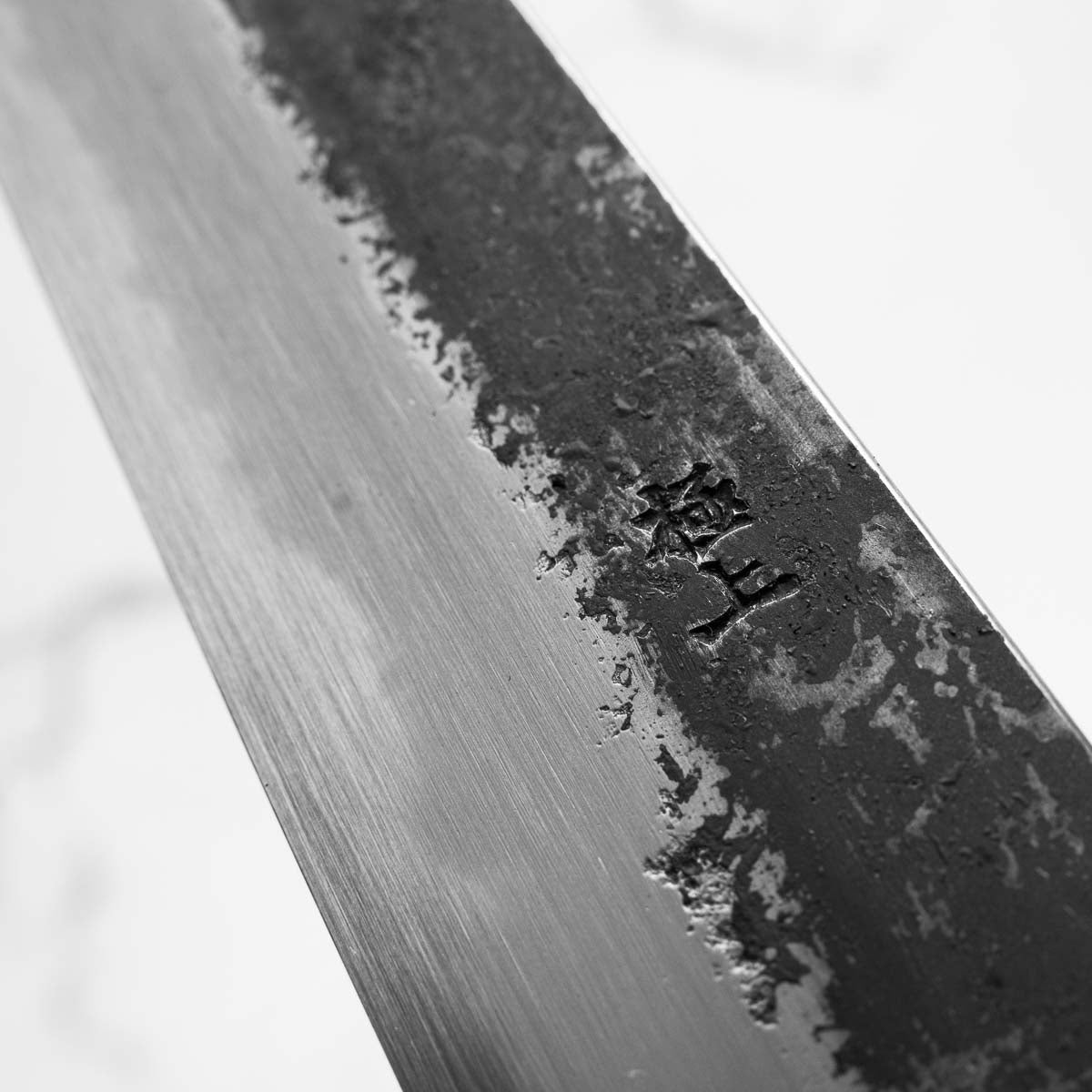 Japanese White Steel #2, a traditional high-carbon steel, is cherished for its purity and fine grain structure, enabling razor-sharp edges, at the cost of being reactive. It is one of the easiest steels to sharpen, but cannot be left wet for even short periods otherwise rust spots can occur. If you’re fastidious in your knife maintenance, this knife can steel can be extremely rewarding to use.