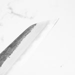 Japanese White Steel #2, a traditional high-carbon steel, is cherished for its purity and fine grain structure, enabling razor-sharp edges, at the cost of being reactive. It is one of the easiest steels to sharpen, but cannot be left wet for even short periods otherwise rust spots can occur. If you’re fastidious in your knife maintenance, this knife can steel can be extremely rewarding to use.