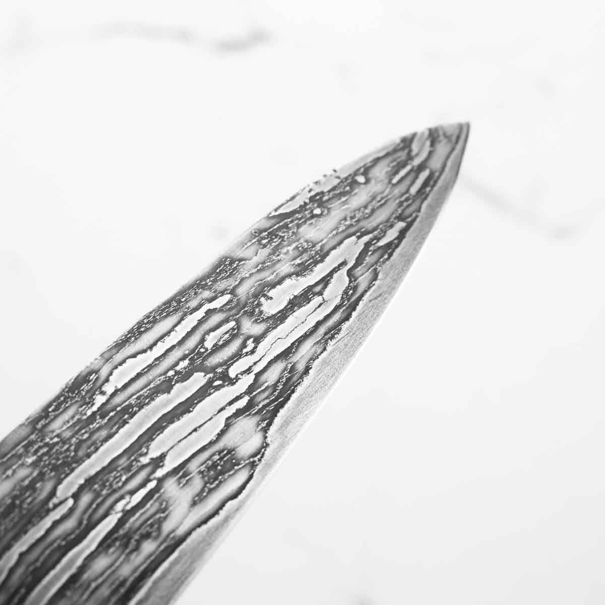 This knife is made from a high-carbon steel and as such, will require a little more care than a regular off-the-shelf knife. It must be dried shortly after use, as prolonged exposure to moisture can cause rust spots to appear. A very light coat of oil during storage also helps to prevent rust spots. A patina (coloration and seasoning of the steel) will occur with use.