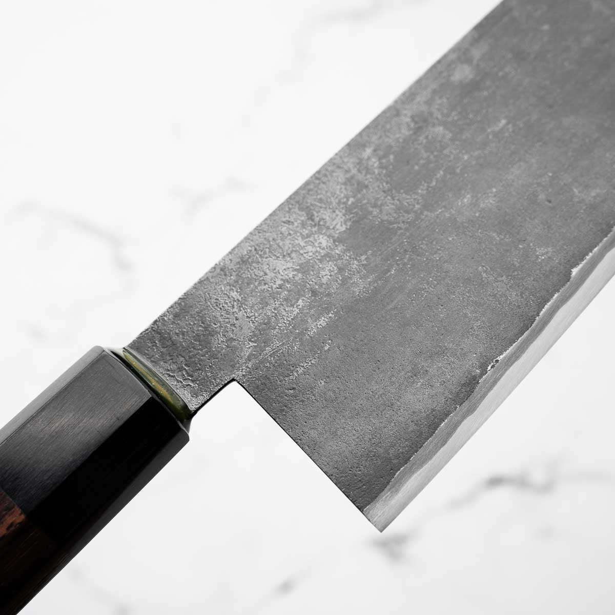 Takeda’s knives are instantly recognizable — tall, kurouchi-finished blades, incredibly lightweight, and ground to an ultra-low bevel that delivers outstanding cutting performance. Often forged from Aogami Super Steel (NAS), these knives are known for holding a razor-sharp edge while being remarkably easy to maintain.