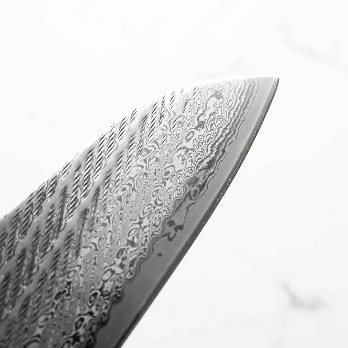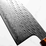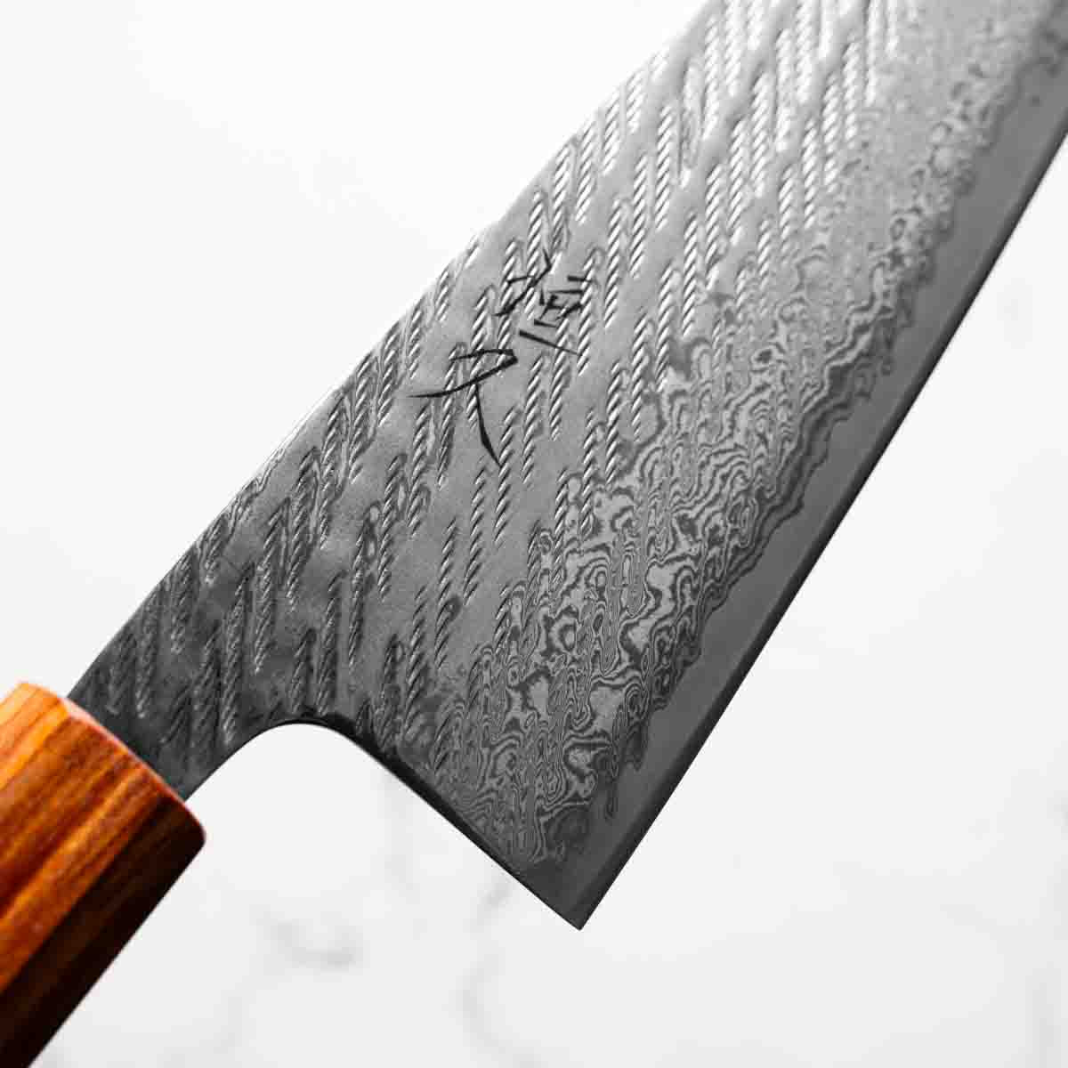 The Santoku knife, a classic in Japanese kitchens, translates to "three virtues," symbolizing its proficiency in slicing, dicing, and mincing. With a shorter, versatile blade and a balanced design, it's ideal for a range of tasks, from cutting meat to chopping vegetables, making it a beloved all-purpose tool.