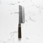 The Nakiri knife, revered in Japanese culinary traditions, is engineered for exceptional vegetable cutting. Featuring a distinct, straight edged, and rectangular blade, it excels in creating uniform, precise cuts and aesthetic presentation. Its technical design ensures efficiency and precision, making it a valuable tool for both professional chefs and home cooks.