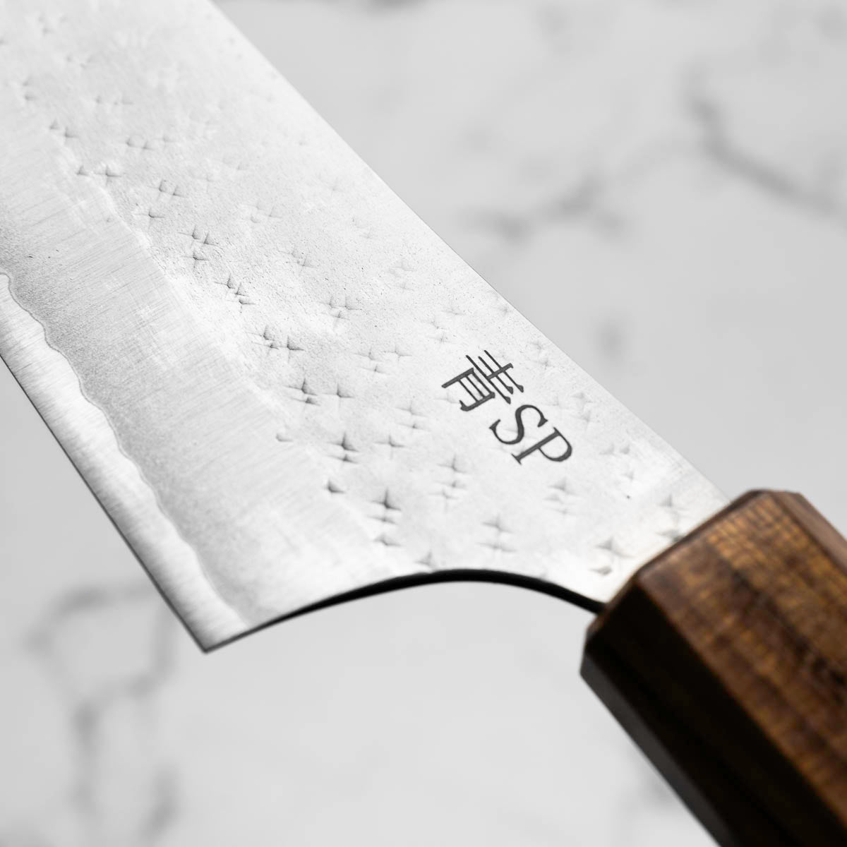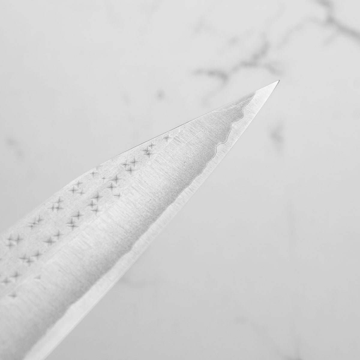 His knives are instantly recognizable for their striking Tsuchime and Suminagashi finishes, thin grinds, and use of high-performance steels such as SG2, HAP40, and stainless-clad Blue Super. Kurosaki’s Fujin series, with its dramatic wind-patterned hammer finish, helped cement his reputation as a blacksmith who blends artistry and technical brilliance in equal measure.