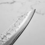 His knives are instantly recognizable for their striking Tsuchime and Suminagashi finishes, thin grinds, and use of high-performance steels such as SG2, HAP40, and stainless-clad Blue Super. Kurosaki’s Fujin series, with its dramatic wind-patterned hammer finish, helped cement his reputation as a blacksmith who blends artistry and technical brilliance in equal measure.